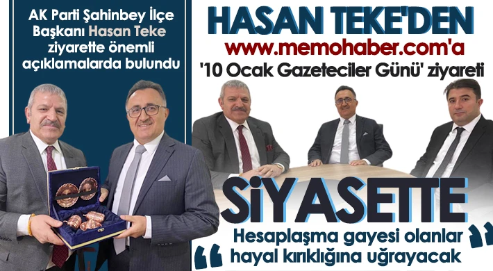 AK Parti Şahinbey İlçe Başkanı Hasan Teke ve Medya ve Tanıtımdan Sorumlu Başkan Yardımcısı Celal Görmez, www.memohaber.com Genel Yayın Yönetmeni Mehmet Taşçı'yı ziyaret ederek '10 Ocak Çalışan Gazeteciler Günü'nü kutladı. Ziyaret sırasında gündeme dair açıklamalarda da bulundu.