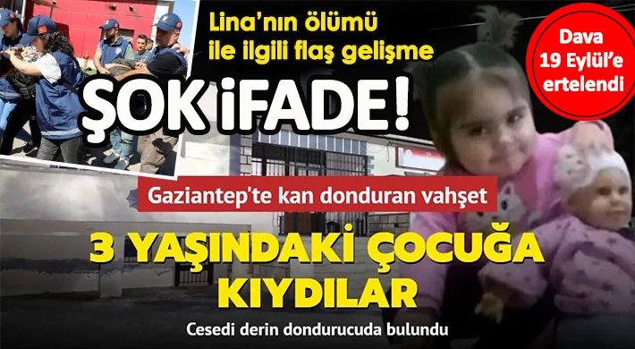 Gaziantep’te darp edilerek öldürüldüğü tespit edilen ve cesedi derin dondurucuda bulunan 3 yaşındaki Lina Nazlı Erbay’ın katil zanlıları ilk defa SEGBİS ile hakim karşısına çıktı. Sanıkların tutukluluk halinin devamına karar veren mahkeme, duruşmayı 19 Eylül'e erteledi.