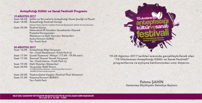 Gaziantep Büyükşehir Belediyesi’nin geleneksel hale getirdiği ve bu yıl 10.’sunu düzenlediği “Uluslararası Antepfıstığı Kültür ve Sanat Festivali”ne birbirinden ünlü sanatçı ve oyuncular katılacak.