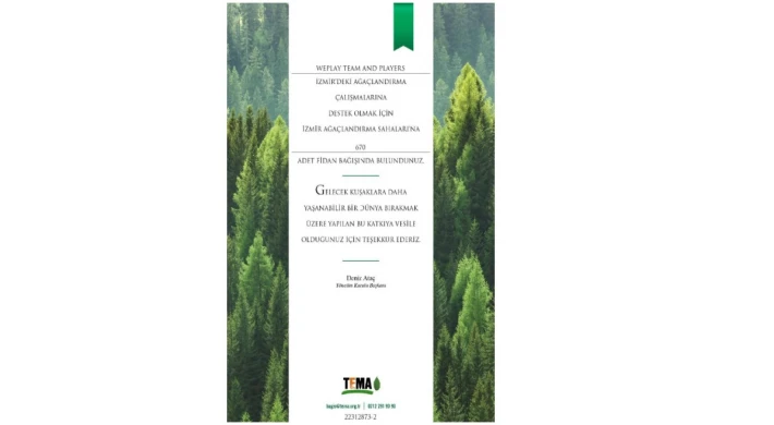 WePlay’in bu sosyal sorumluluk kampanyası kapsamında TEMA Vakfı’na toplamda 670 fidan bağışlandı. Bu fidanlar, yangından etkilenen bölgelerdeki ağaçlandırma ve ekolojik restorasyon projelerinde kullanılacak. Amacımız, Türkiye’nin yeşil dokusunun yeniden canlanmasına destek olmak ve çölleşme tehdidine karşı birlikte güçlü bir direnç oluşturmak.